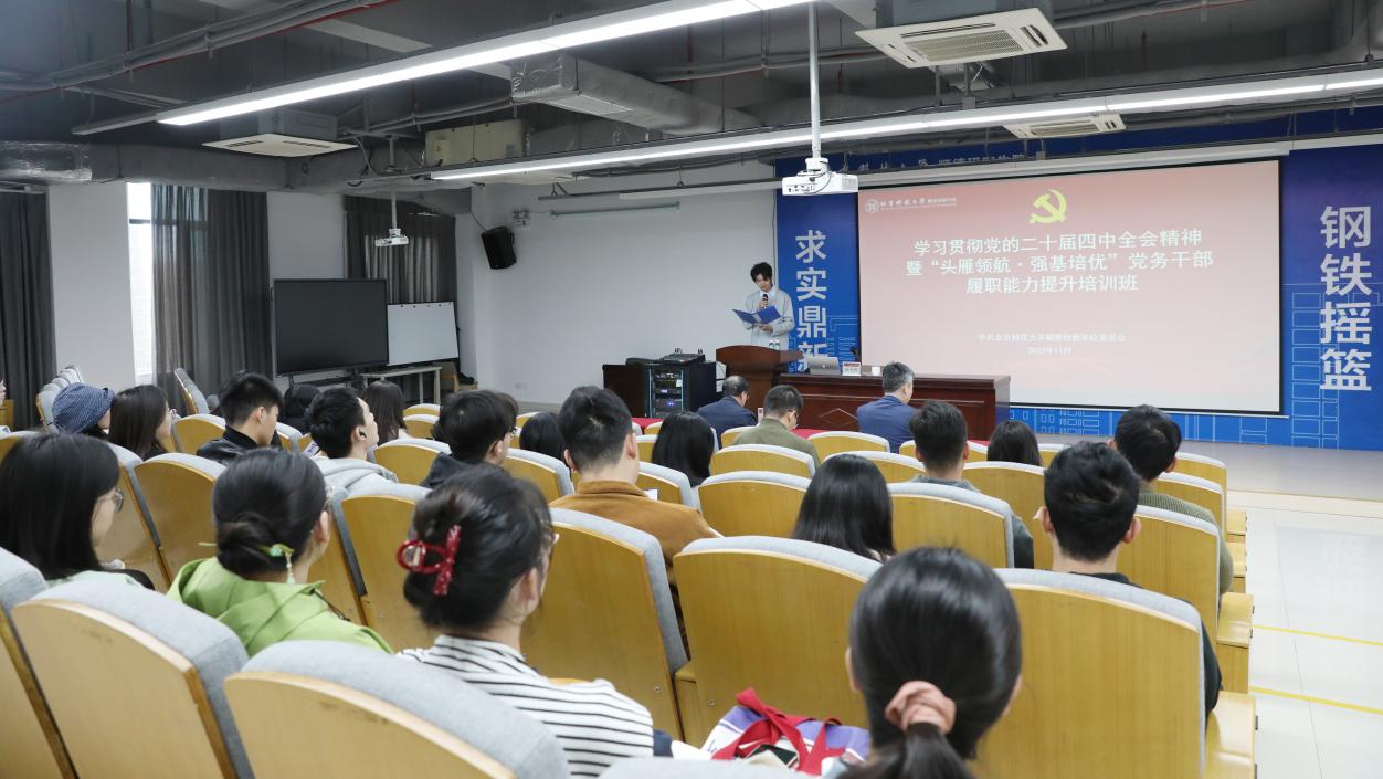 为深入学习贯彻党的二十届四中全会精神,切实把师生思想和行动统一到全会精神上来,11月21日上午,北京科技大学顺德创新学院举行“学习贯彻党的二十届四中全会精神暨党务干部履职能力提升培训班”第三讲。本次培训特邀中共佛山市委党校杨书群教授作题为“深学笃行党的二十届四中全会精神 接续推进中国式现代化”专题辅导。顺德创新学院院长何新波与师生党员共同参加了学习。